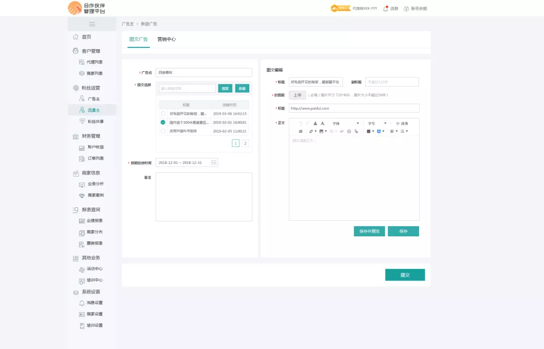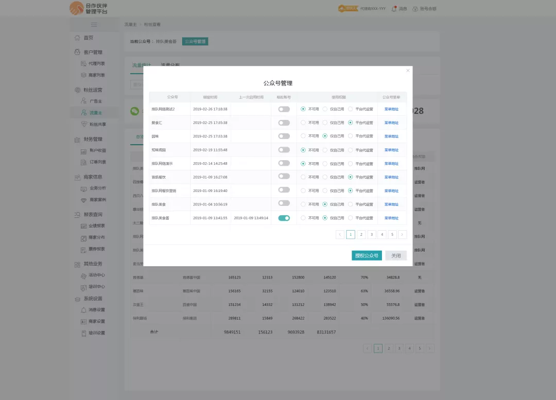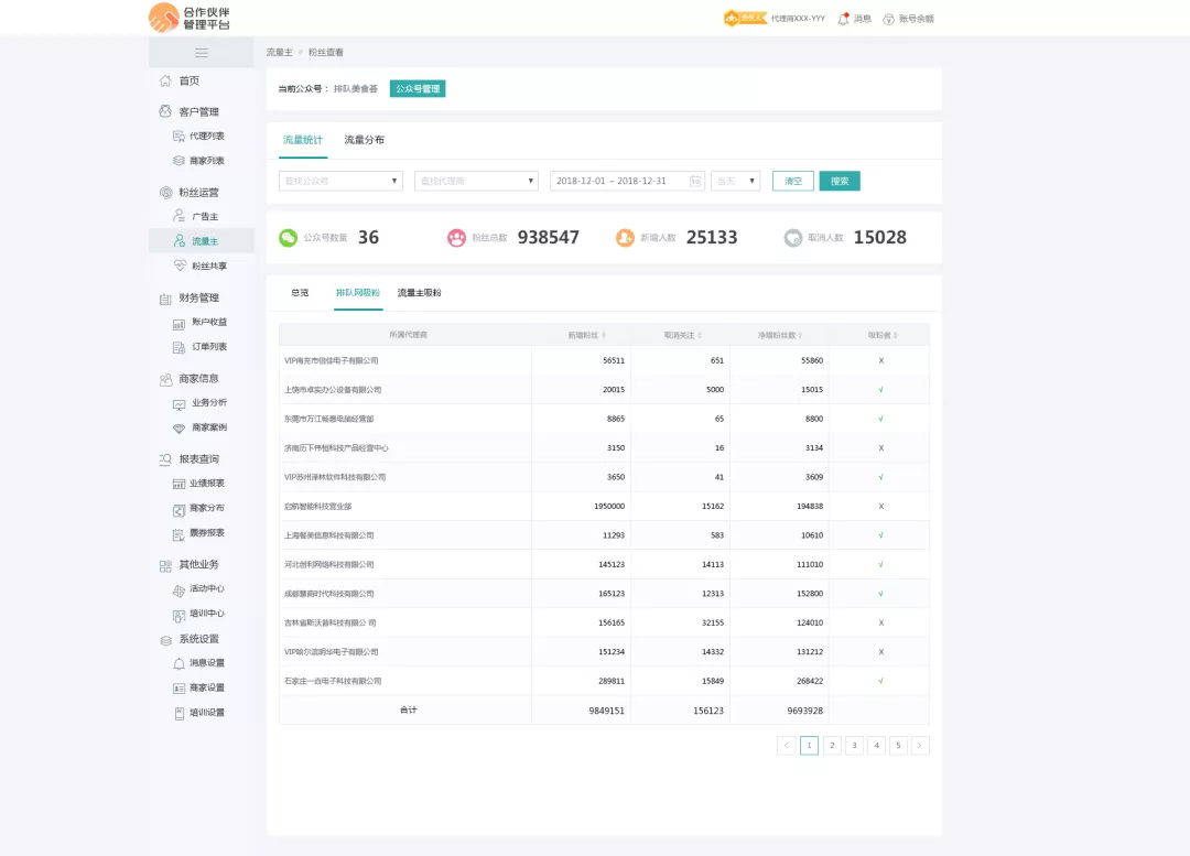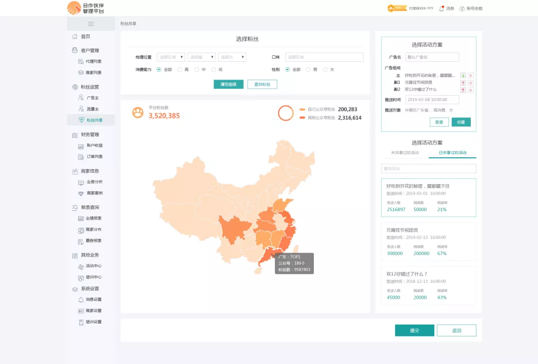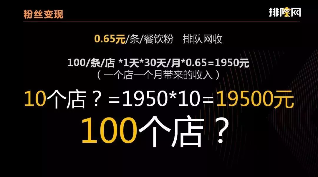 系統功能 粉絲運營平臺是由排隊網推出的精準引流系統。依托排隊網海量的商戶和粉絲資源,強大的業務分析模型,真正實現基于用戶的精準投放,實現成本可控、效果可觀、智能投放平臺。 聚合粉絲 聚合粉絲:聚合線下粉絲,快速自建流量池 利用排隊、點菜、支付、電子發票、參與活動等,在滿足消費者就餐便捷性需求的同時,吸引餐飲行業精準粉絲。 例如,掃碼點餐、支付掃碼,在這個過程中完成自動吸粉、轉化會員,讓餐廳和顧客保持更多接觸,增強雙向交流,從而增強后續營銷機會。 粉絲共享 粉絲共享:平臺粉絲互通,為您帶來高額的流量變現收入,幫助客戶最大化地享受粉絲紅利 擁有粉絲者可以發布資源交易信息;商家、運營者可以發布營銷廣告需求信息。 例如,一家正常餐飲商家,每天接待100個客人,通過掃碼點餐的方式,讓他們關注公眾號了。那么一個月30天,就有3000個粉絲。按照粉絲運營平臺的獎勵政策,一個月一家商家的3000個粉絲就有1,950元的收入。不要小看這個數字。如果你有10個餐飲商家呢?19,500元。要是你有100個餐飲商家呢?195,000元。 兄dei,有見過這么好賺的生意嗎? 粉絲運營 粉絲運營:釋放流量價值,實現深度運營 可以綁定多個公眾號,管理所有粉絲資源;可以獲取管理的所有公眾號資源的流量分成;可以幫助任何商家設定會員權益,策劃公號內容營銷方案。 精準營銷 精準營銷:系統化管理消費者,更多會員更多成交;匯聚餐飲行業優質流量,貼合各種運營場景,更好實現商業目標。 線下實體商家都面對著海量會員,但是無論是給會員推送信息,還是做會員數據的挖掘個分析,都需要成本付出。比如最普遍的信息推送,若不是踩準會員的關注點,推送不僅是成本的浪費,反而會成為干擾會員生活的“垃圾信息”。 粉絲運營平臺,就可杜絕出現這樣的狀況! 客戶標簽精準畫像,比消費者本身更懂自己;會員卡/儲值卡/會員權益,精準營銷提升客單。會員完整生命周期互動運營,為其提供個性化服務,提高顧客對商家的粘性。 效果監測 效果監測:海量用戶,精準定向投放,效果持續監測 廣告投放完畢,第二日就可以查看每條廣告所對應公眾號的閱讀人數閱讀率情況了,數據完美展現,下次就知道哪些廣告粉絲超愛啦~ 數據分析 數據分析:多維度數據分析,科學化公號運營及內容投放 流量分析、交易分析、客戶消費行為分析等全方位數據剖析,驅動后期餐廳運營決策的調整。 兩大角色 兩大角色:吸粉者和運營者 成為吸粉者,流量變現,輕松賺錢;成為運營者,掌握主動權,投放廣告,精準營銷。 吸粉者是粉絲運營平臺里的重要角色,通過粉絲運營平臺吸粉的公爵和途徑方式來獲取粉絲流量,讓用戶的流量價值得到釋放。 ① 重新認識粉絲價值,挖掘更多可盈利模式。 ② 獲粉來源,覆蓋餐飲消費全流程。 ③ 精準吸粉,高額吸粉分傭。 運營者是粉絲運營平臺里的更為高階的角色,根本在于:擁有自己的公眾號,自己掌握主動權,可通過公眾號運營、策劃、營銷等,實現粉絲變現。 ① 吸粉,使用專屬公眾號為沒有公眾號的餐飲商家開展排隊點餐,打造屬于自己的流量池。 ② 留粉,通過活動、小說、優惠等推送方式,留存粉絲同時也精準分析粉絲屬性。 ③ 營銷,使用營銷工具來推廣自身或客戶的產品(小說運營,活動策劃等),從而實現粉絲變現。 附加服務 專業客服答疑:有7*12小時專業指導,幫助客戶答疑解惑。 線上視頻教學:排隊網定期線上直播,讓用戶隨時隨地學習,提升能力 同行交流活動:直播、私享會、實戰分享等 排隊學院助力:導師一對一指導,培養同盟轉型運營商