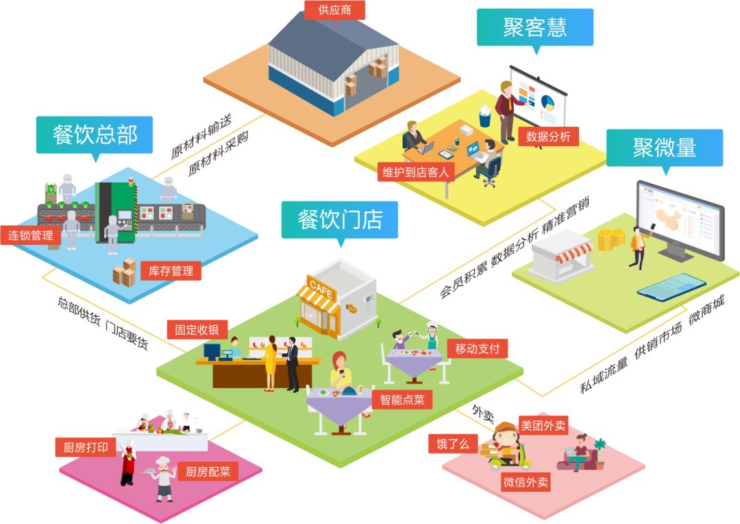 與微信、聚食匯系統聯動,可使用多種營銷工具,改善老客流失,拉新鎖客,增加用戶黏性。