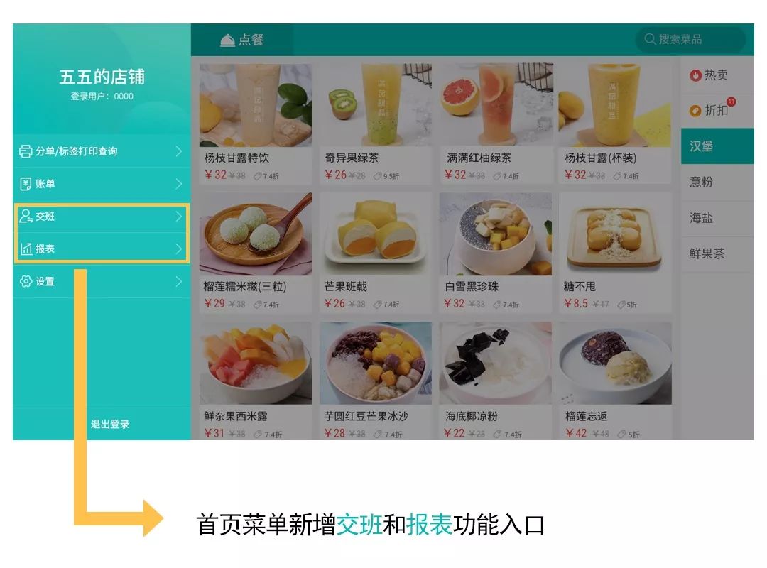 增加了交班和報表兩個功能入口,更方便餐飲商家管理人員、查看報表。
