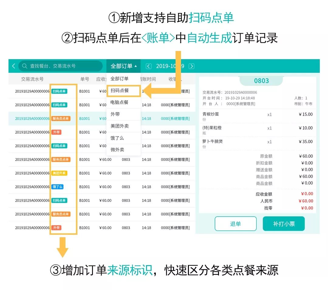 可以支持掃碼點單,并自動在賬單中生成訂單記錄,賬單查詢也增加了來源標識,輕松區分掃碼點餐和服務員點單就是這么easy~