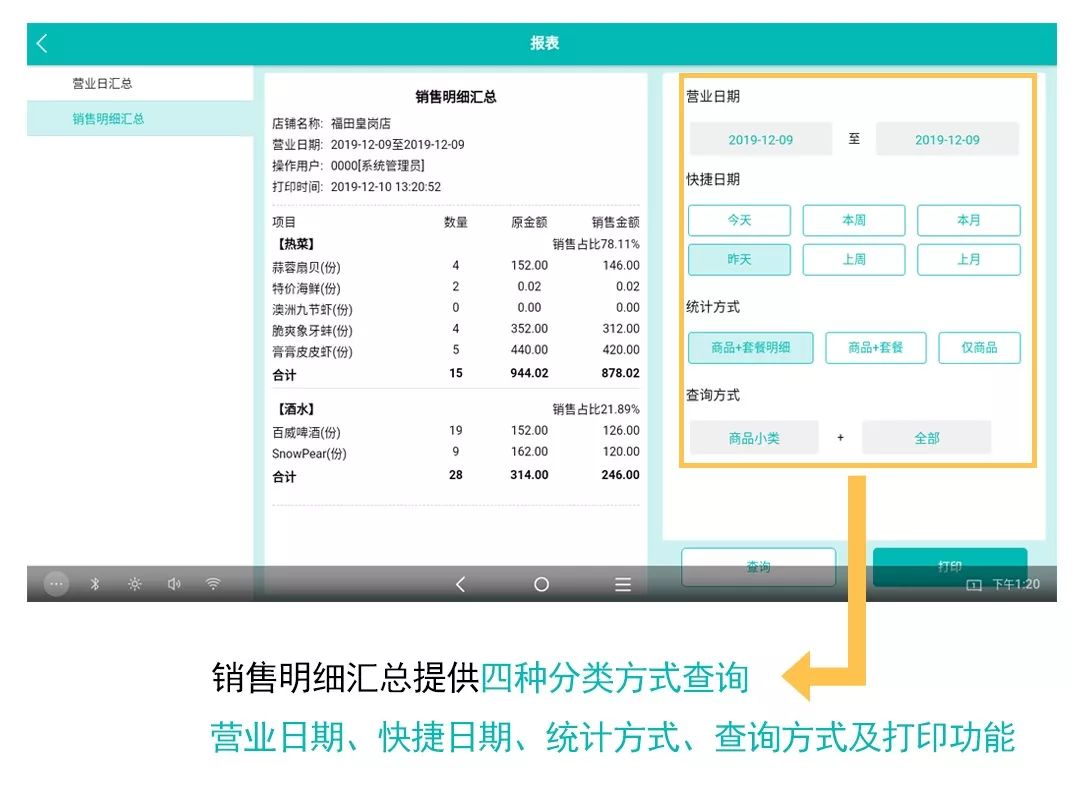 在報表功能,增加營業日匯總和銷售明細匯總,可通過不同分類查詢,讓每一項消費記錄都有跡可循。
