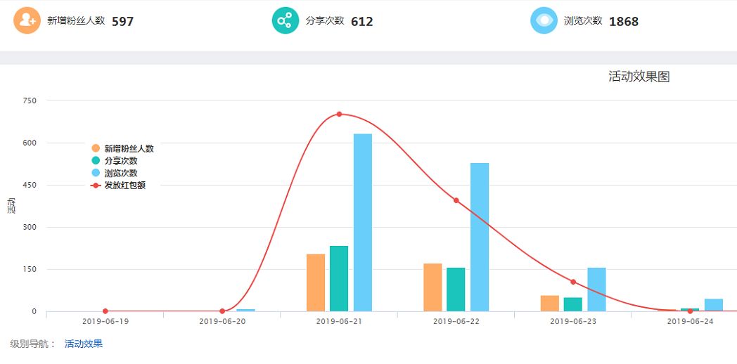 通過排隊網后臺可以直接清晰明了的看到新增粉絲、分享次數、瀏覽次數、發放紅包額活動數據,活動有沒有效果,一看便知!