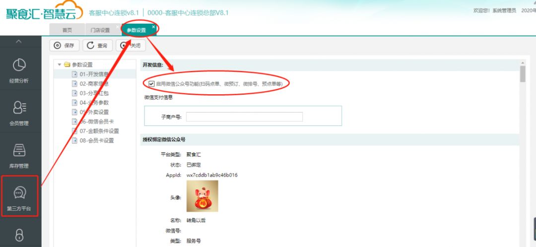 登陸聚食匯后臺綁定公眾號后,在第三方平臺→參數設置→勾選“啟用微信公眾號功能”。