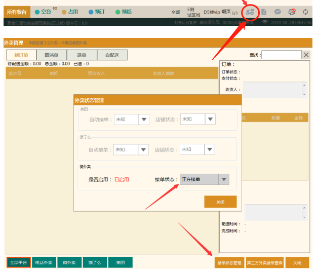 在聚食匯前臺點擊外賣小車圖標→外賣狀態管理→ 狀態→開啟接單即可。