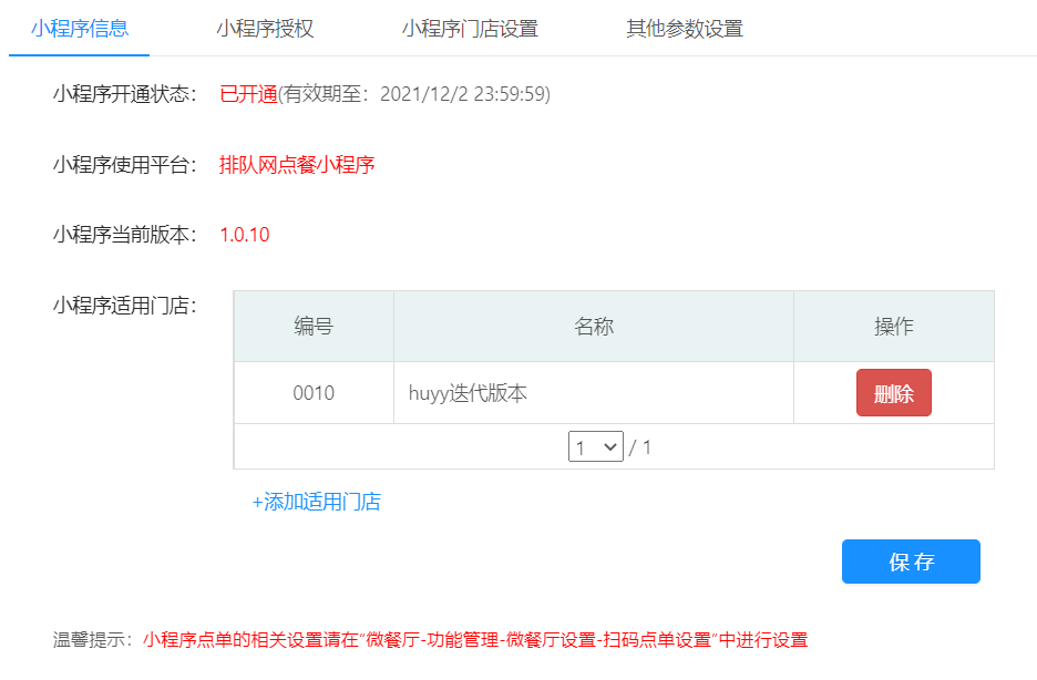 4、后臺-小程序-小程序門店設置,去除“小程序桌臺碼”