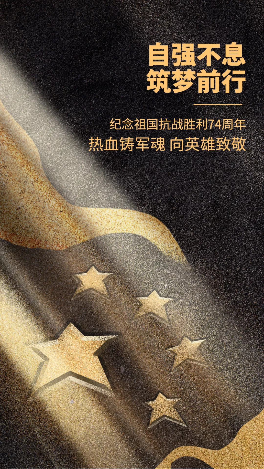 2019年9月3日,是中國抗日戰爭勝利74周年紀念日。最適合的就是歌頌主旋律,圖文內容可表現致敬、緬懷先烈、銘記歷史、筑夢前行等意思。