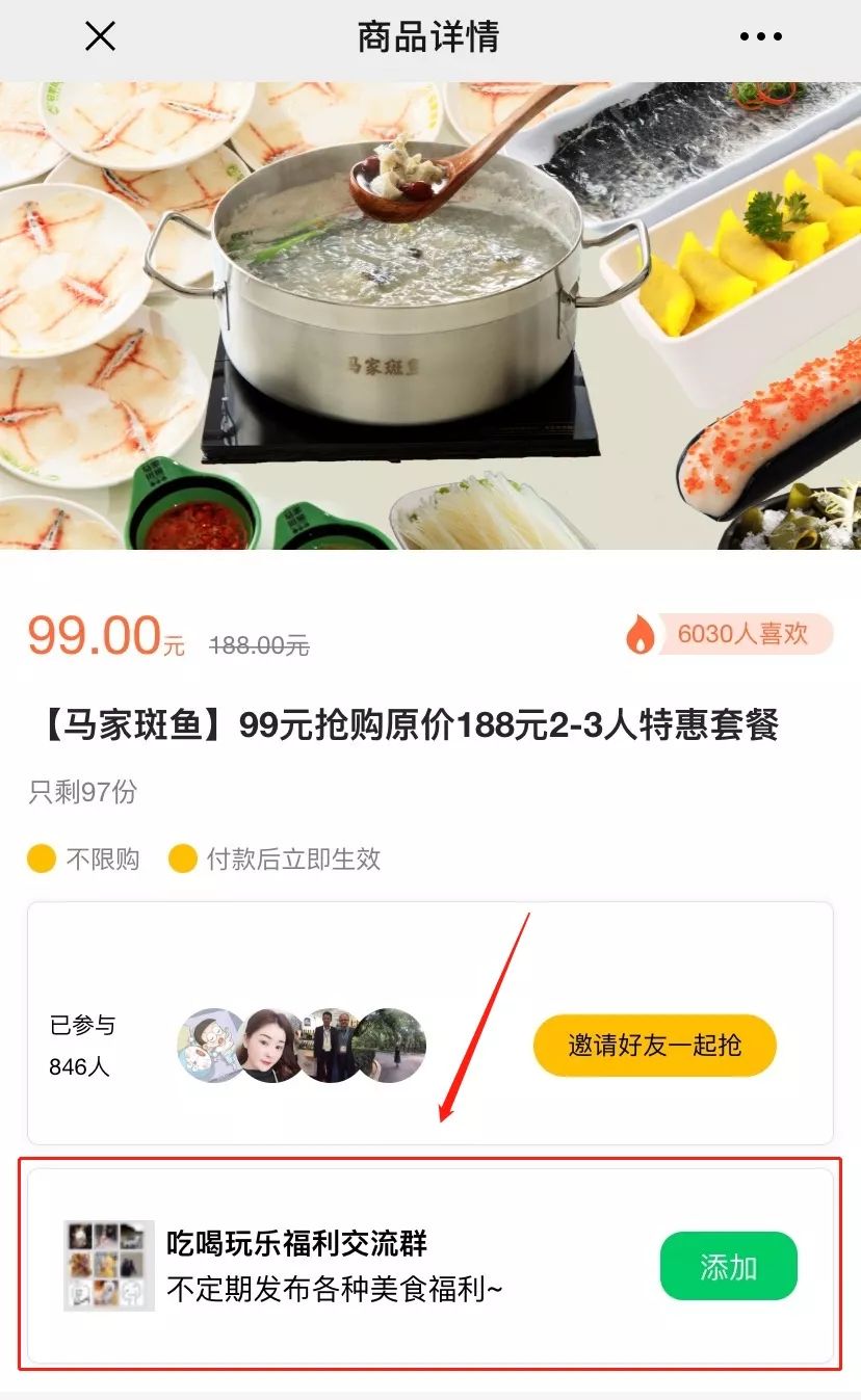 馬家斑魚通過排隊網微商城設置購買需關注公眾號,3天吸粉2000+。同時,在商品詳情頁增加進群按鈕,0成本就獲得精準用戶,增加銷售渠道,也方便更好的維護客戶。