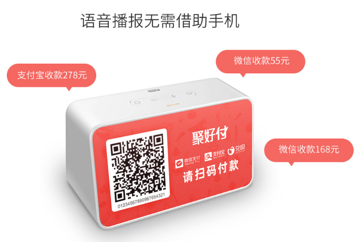 聚好付云音響:支持聚好付所有交易訂單的語言播報、0.1秒時間極速語言報賬、超長24小時待機、wifi+2g的雙網模式支持內插流量卡,不用手機也能報賬!