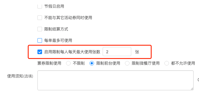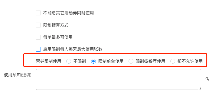 ②票券增加可設置限制使用場景(是否允許線上或線下使用)