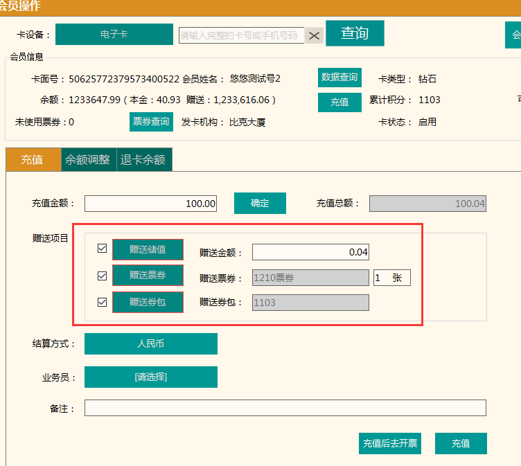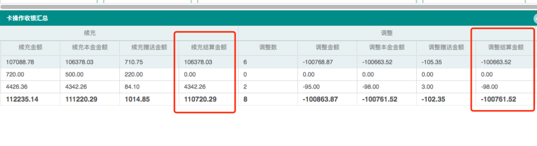 4.【卡操作收銀匯總】報表,續充/調整分別增加"結算金額"列,續充本金改為實際充值的本金金額