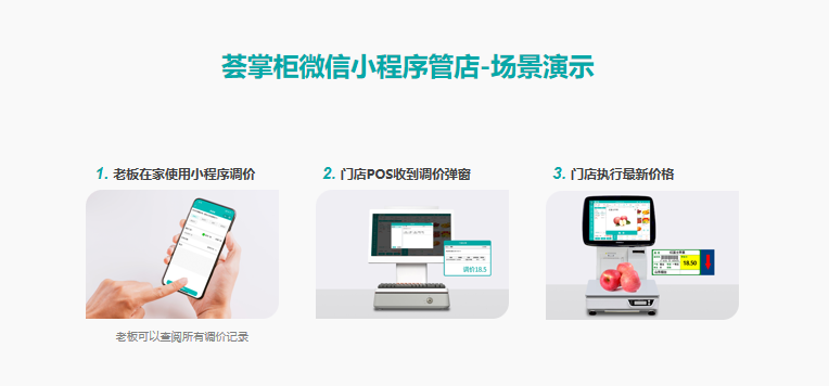 在內部協同上,管店小程序薈掌柜打通了門店POS的消息推送通道,老板在外時也能通過薈掌柜快速調價,安全、及時、有效地傳遞企業內部的經營數據和提醒消息,改變以往微信群內發消息的低效易錯,極大提升內部交互效率。