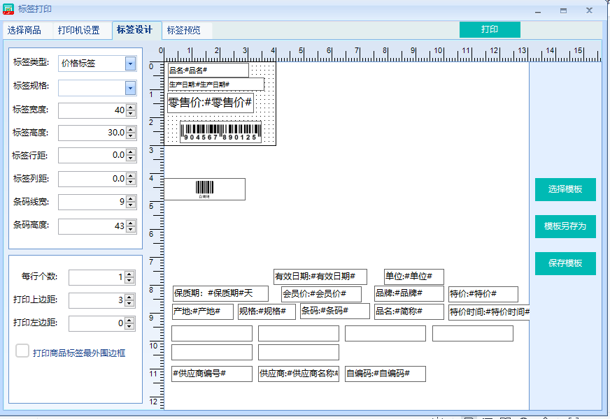 價簽周圍有標尺,對應的是價簽紙的實際大小,系統支持對價簽自定義排版,常用的標簽關鍵詞我們都備好了,直接拖拽使用即可。