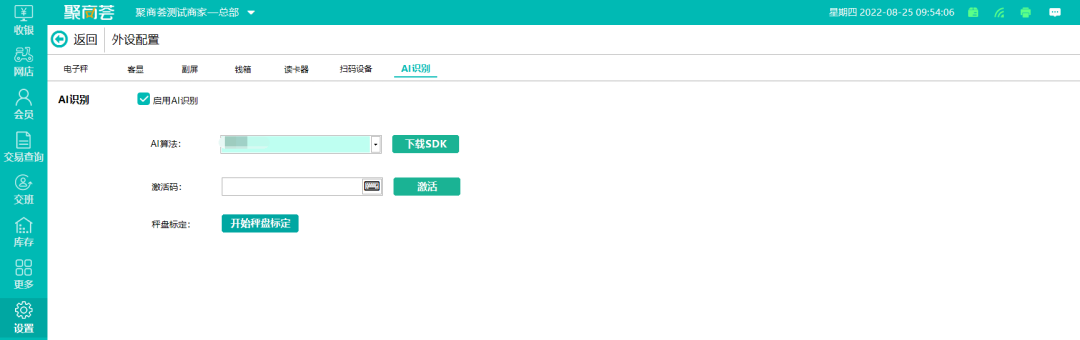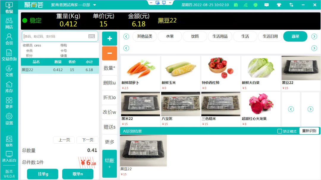前臺POS內置AI識別算法,并適配了湃揚C600 智能AI收銀秤,只要將蔬菜、水果等商品放在AI收銀秤上,不需要輸入編碼,系統自動識別出蔬菜、水果名稱